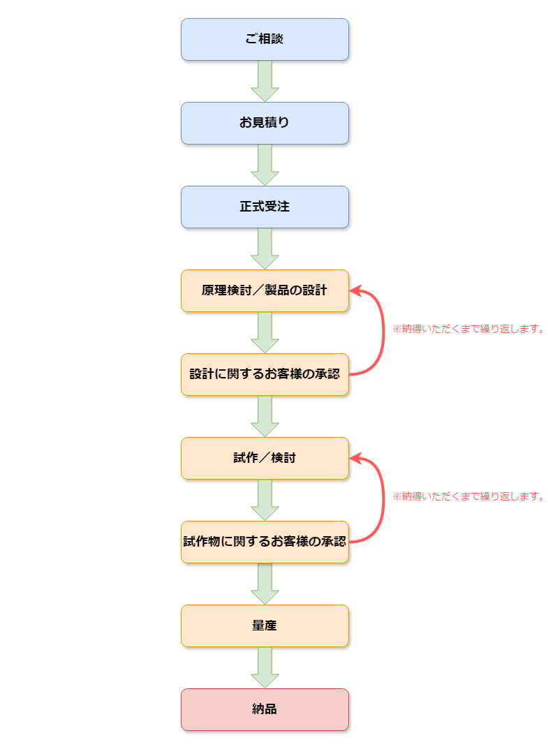 お客様に製品の仕様や製造する製品のイメージや概念を提供して頂きます。 その後、弊社側が製品を設計し、チェックを行い、お客様に承認を頂きましたら、製品の試作を行い、最終検討して問題ないかをチェックし、製造を行います
