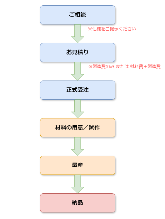 お客様に製品の設計・製品に関する資料(製品図、各パーツ情報、水準、包装仕様など)を提供して頂き、弊社がその仕様ないしはご指示に準じて生産を致します。